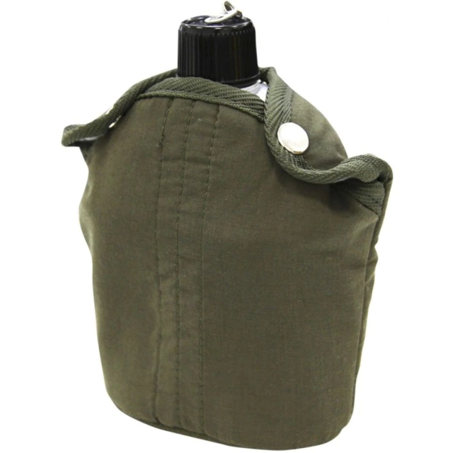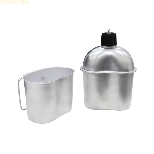 Possui também uma capa térmica isolante confeccionada em algodão, com passante para cinto comum e de soldado, e a tampa vem com uma corrente ligada ao cantil para evitar sua perda.