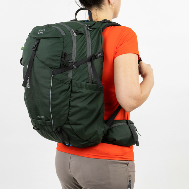 Mochila técnica com capacidade para 26 litros. Confeccionada em Velox Rip Stop 257 é resistente à água, abrasão e aos rasgos, com revestimento em Dry System nas partes em contato com o corpo para absorção de suor. Possui dois acessos principais com fechamento em zíper, bolsos frontais (um deles expansível), bolsos laterais com elástico. Os bolsos da barrigueira são destacáveis e podem ser usados diferentes locais.